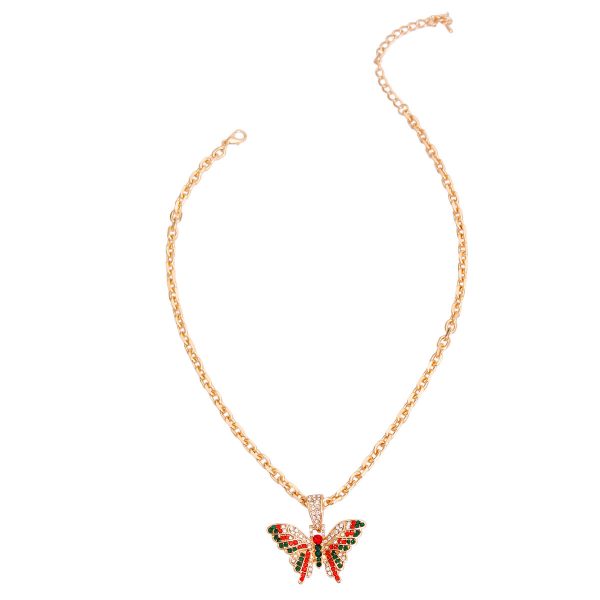 Designer Style Gold Metal Oval Chain Link Necklace Featuring Butterfly Pendant with Red and Green Rhinestone Detailing. Butterfly measures 1.5 inches wide and 1.25 inches long