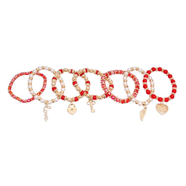 Gold, Pearl, and Red Glass Beads Stretch Bracelet Set Featuring Love Charms. 7 Pcs Set