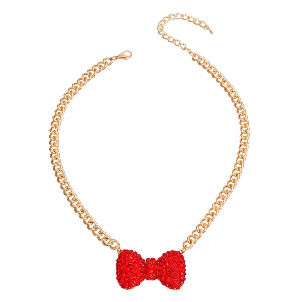 Gold Metal Chain Necklace Featuring Bow Pendant with Red Rhinestone Detailing. Bow measures 1.75 inches wide and 1 inch long