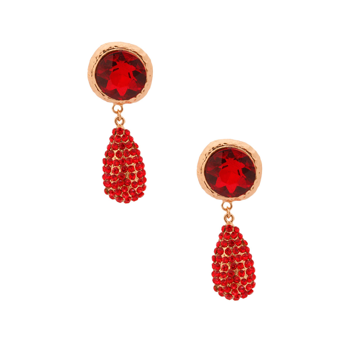 Gold Textured Metal and Round Red Crystal Clip On Earrings Featuring Rhinestone Crusted Teardrop Detail. Earrings measure 1.25 inches wide