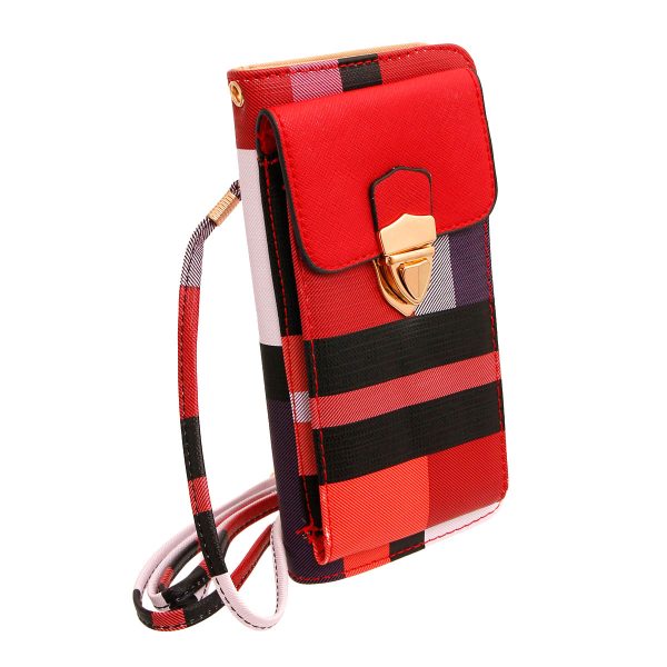 Red Plaid Vegan Leather Cellphone Wallet Wristlet Crossbody Featuring Cellphone Pocket with Flap and Gold Lock Closure. Wallet has Zipper Closure. Interior has Zipper Pocket and Credit Card Slots. Includes Removable Shoulder Strap and Wrist Strap. Cellphone Pocket measures 7 inches x 3.75 inches