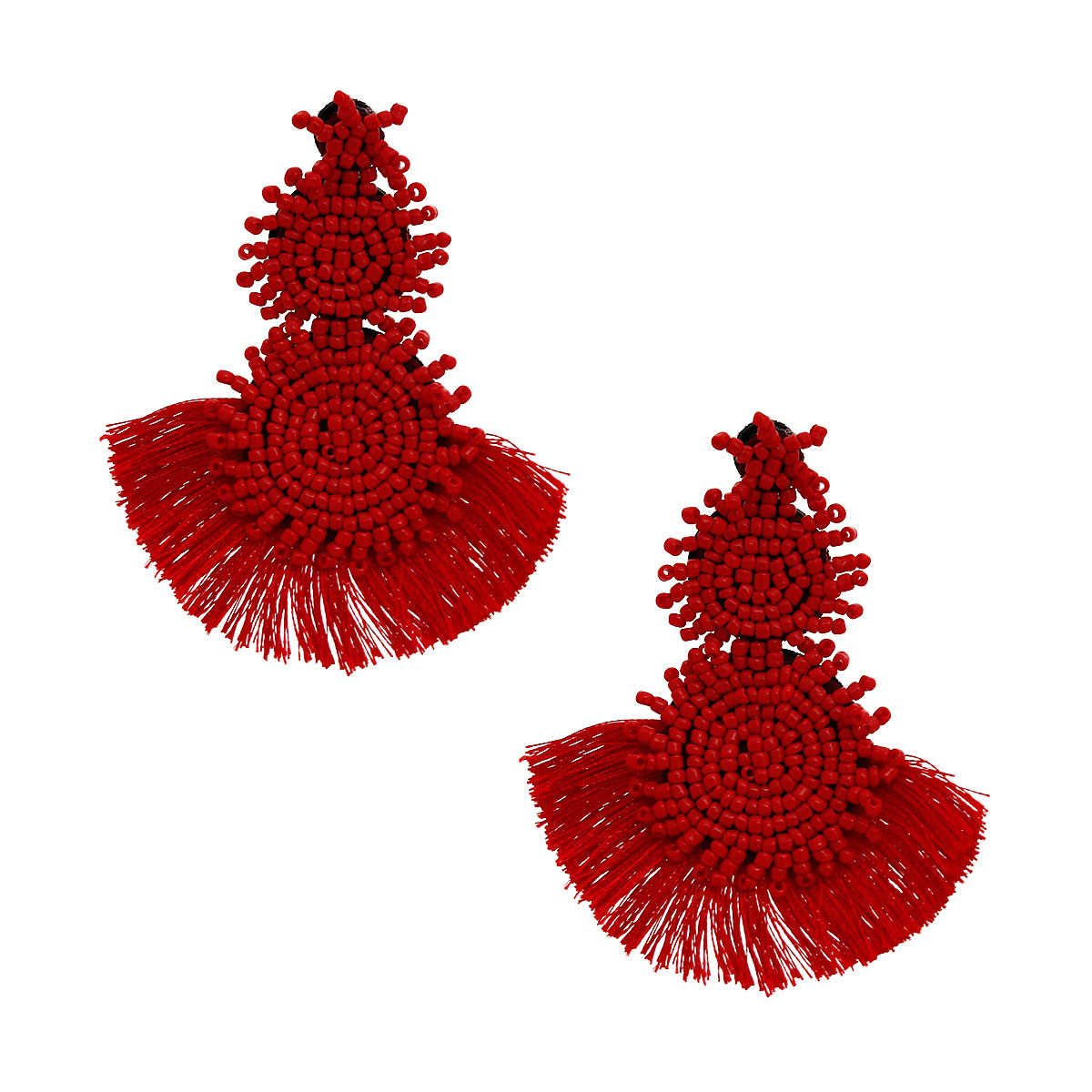 Red Seed Bead Graduated Trio Circle Drop Earrings Featuring Silk Fan Tassel Detail. Felt Backing. Earrings measure 2.75 inches wide