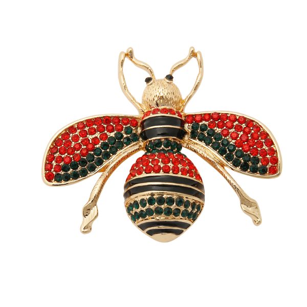 Designer Style Gold Bee Brooch Pin Featuring Red and Green Rhinestone Detail. 2.25 inches long