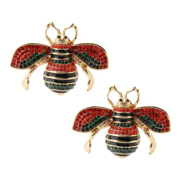 Designer Style Gold Bee Stud Earrings Featuring Green and Red Rhinestone Detail
