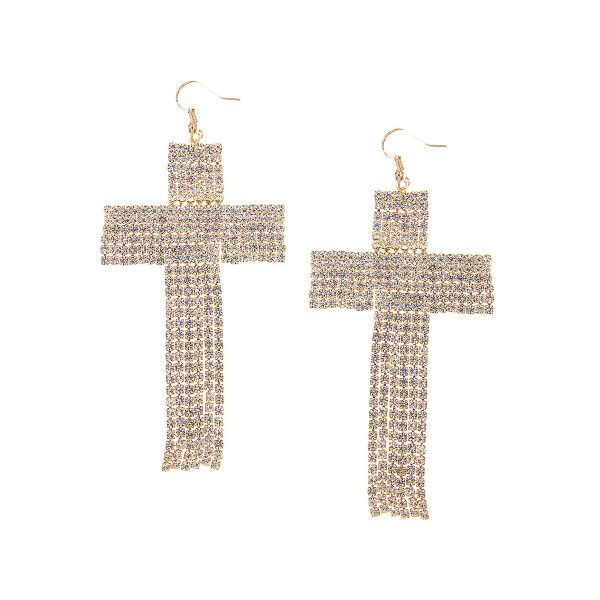 6 Lined Rhinestone Fringe Cross Gold Plated Earrings. 1.7 Inches wide and 3.78 inches long.