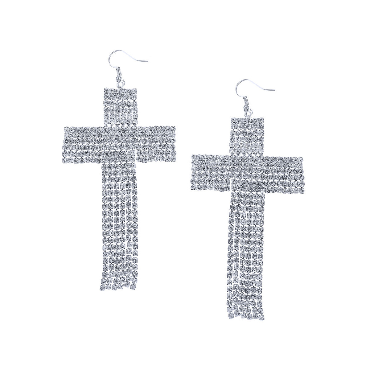 6 Lined Clear Rhinestone Fringe Cross Silver Earrings. 1.7 Inches wide and 3.78 inches long.