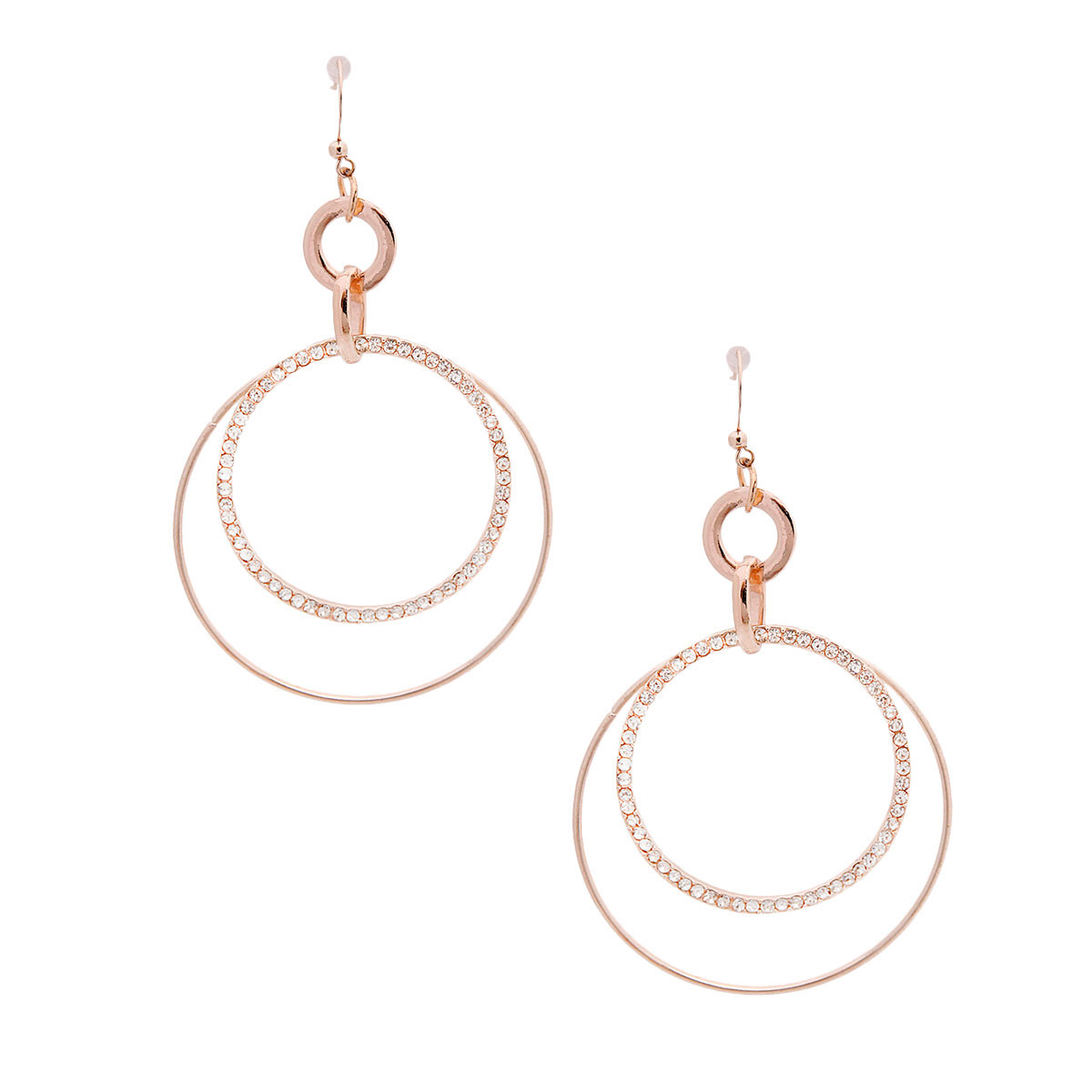 Rose Gold Metal Double Circle Drop Earrings Featuring Rhinestone Detailing. Earrings measure 2.25 inches wide