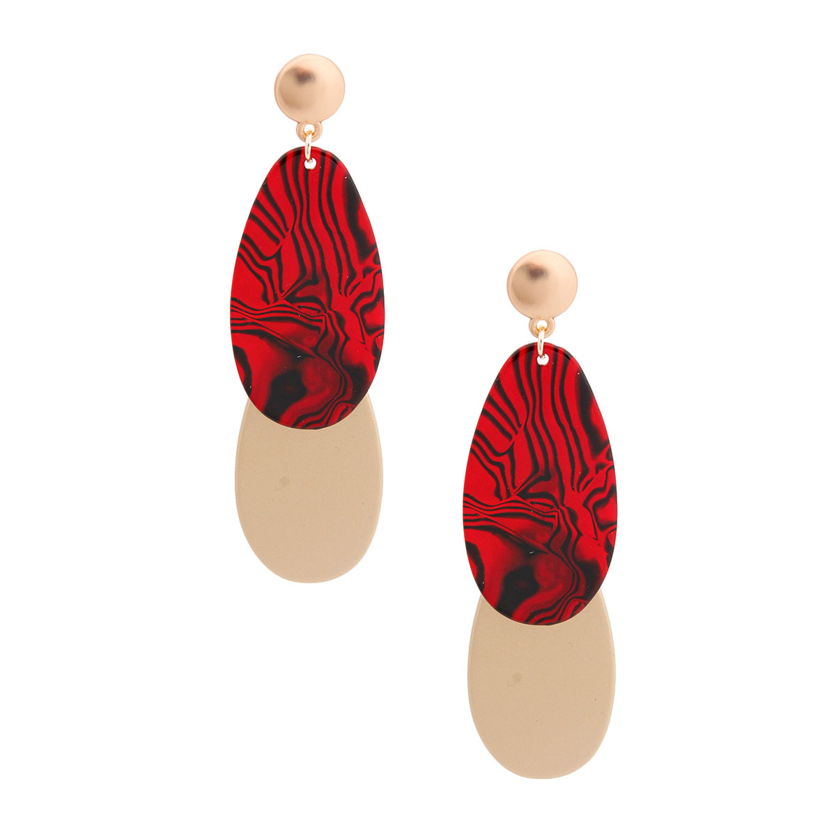 Gold Metal Circle Drop Earrings Featuring Shiny Marbled Red Acrylic Teardrop and Metallic Gold Plastic Teardrop Details. Earrings measure 1.25 inches wide