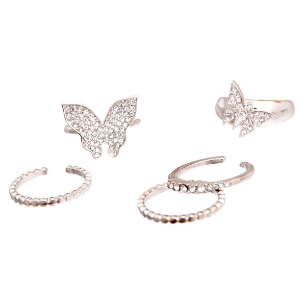 Silver Metal Adjustable 5 Pcs Ring Set Featuring Butterflies and Rhinestone Detailing