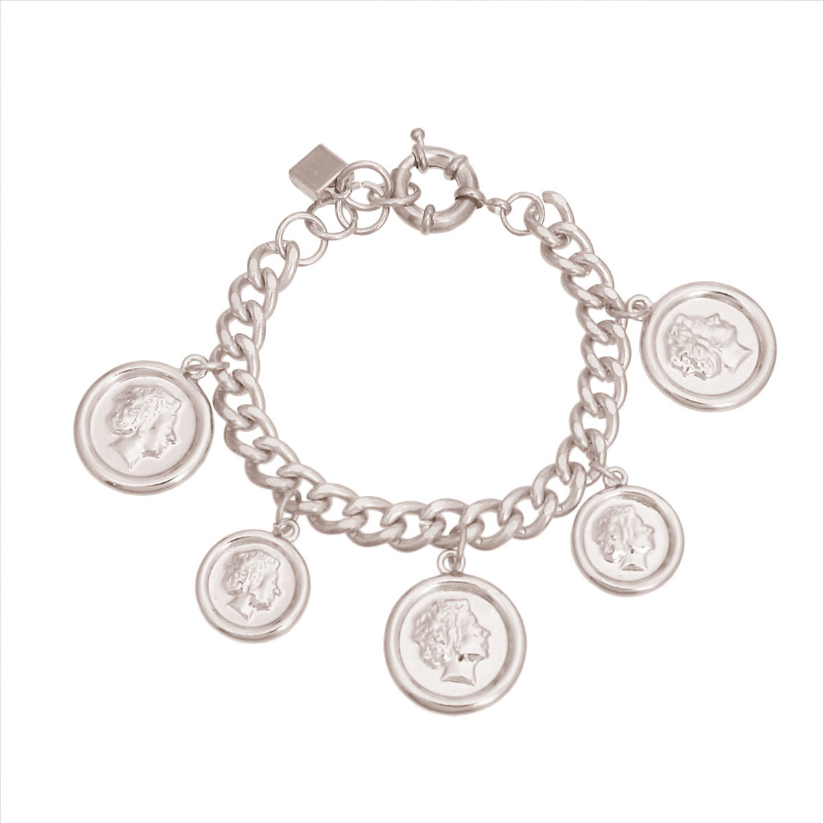 Silver Metal Chain Bracelet Featuring Varying Sized Historic Coin Charms. Large Coin measures 1 inch