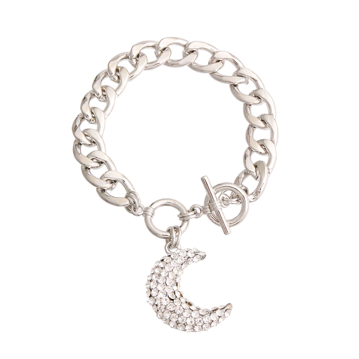 Silver Metal Chain Toggle Bracelet Featuring Clear Rhinestone Crescent Moon Charm. Charm measures 1.25 inches