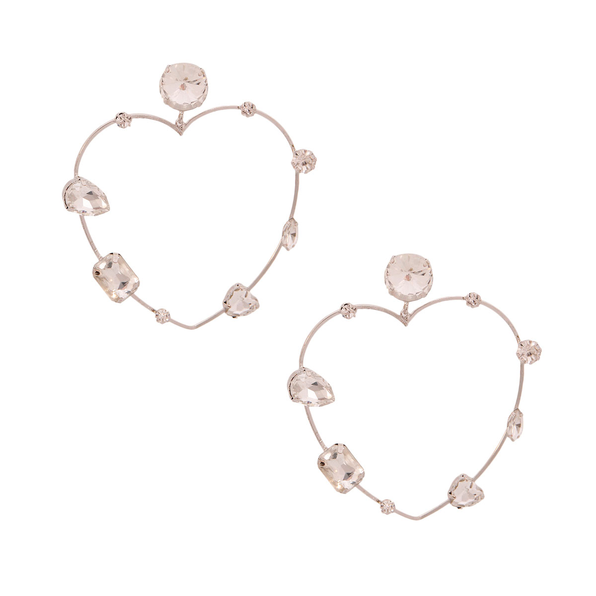 Silver Metal and Clear Crystal Heart Drop Earrings Featuring Various Crystal Shapes. Earrings measure 3 inches wide