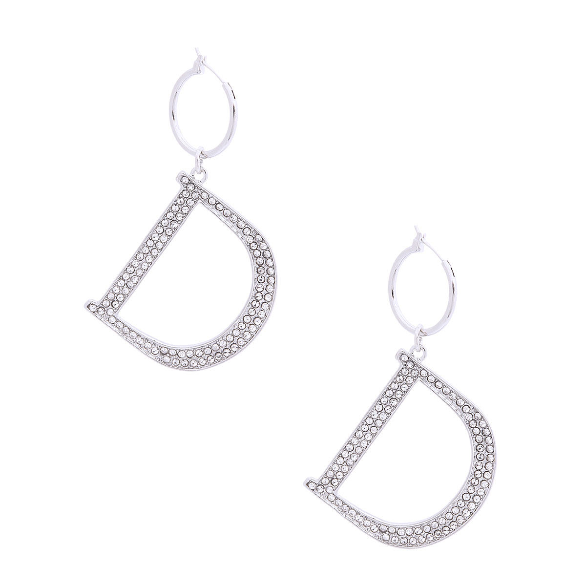 Silver Metal Baby Hoop Earrings Featuring Dior Style Rhinestone D Charm Detail. D measures 1.75 inches