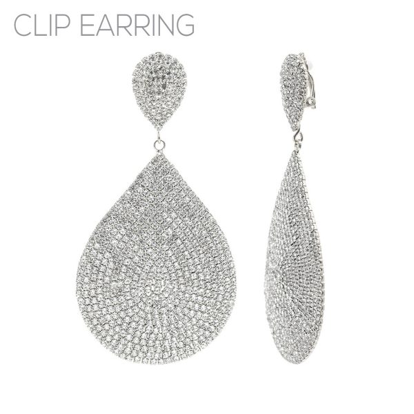 Silver Metal and Clear Crystal Rhinestone Double Teardrop Clip On Earrings. Earrings measure 1.93 inches wide