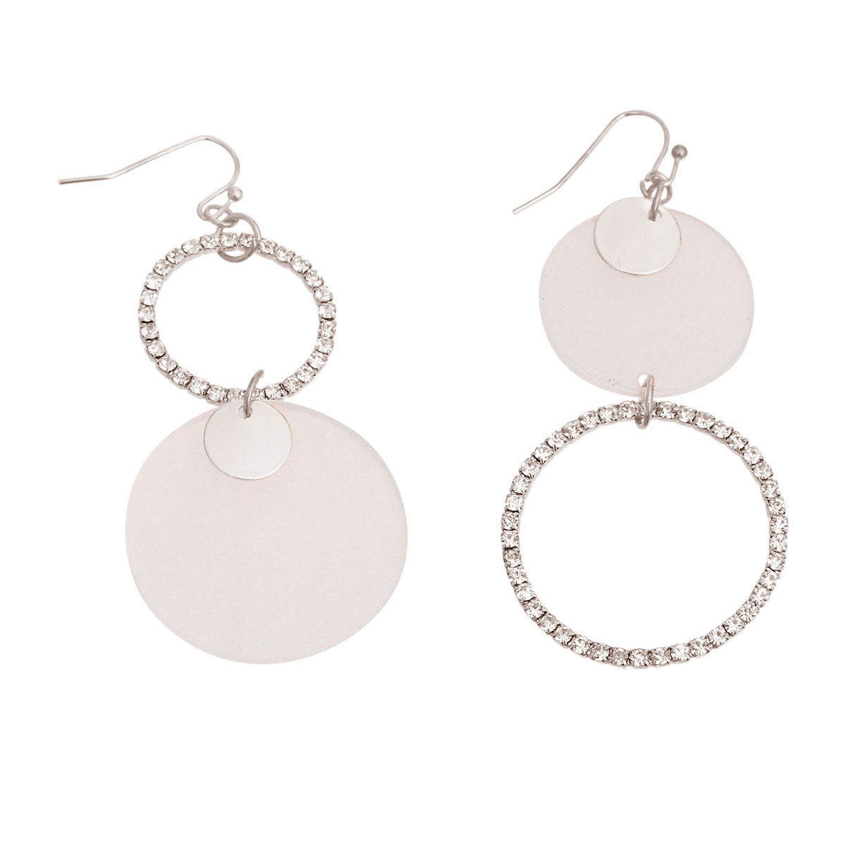 Silver Metal Fish Hook Mismatched Rhinestone and Acrylic Circle Drop Earrings. Earrings measure 1.25 inches wide