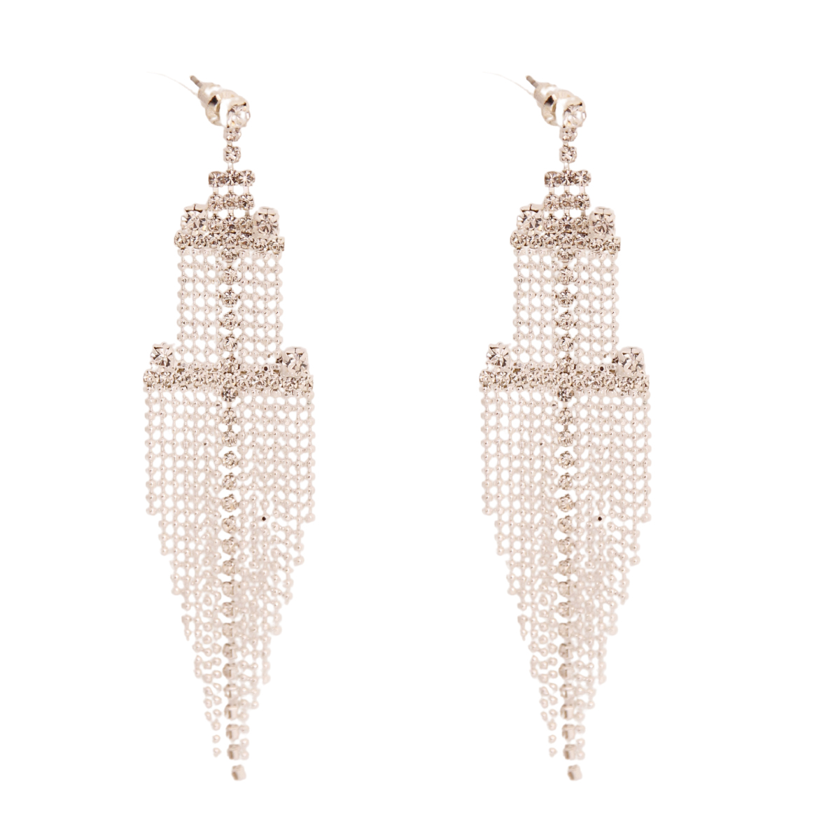 Silver Metal Chandelier Fringe Drop Earrings Featuring Rhinestone Detailing. Earrings measure 1 inche wide