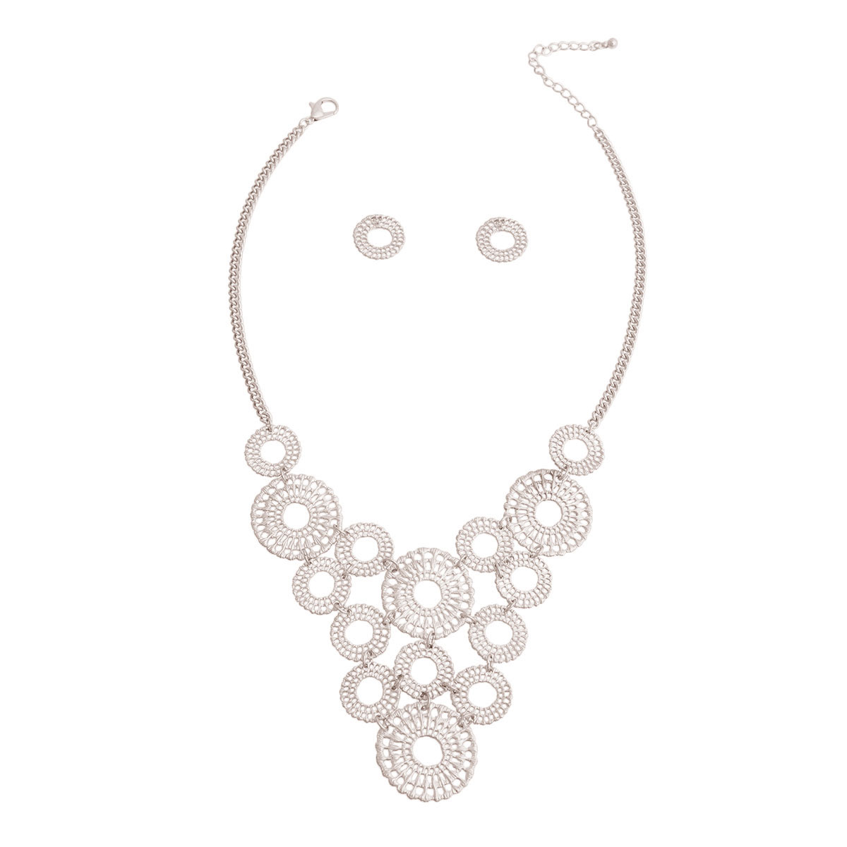 Silver Metal Chain Necklace Set Featuring Round Pattern Bib Detail. Bib measures 3 inches long