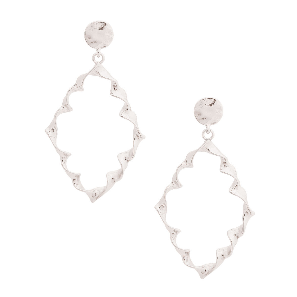 Silver Metal Twisted Teardrop Earrings. Earrings measure 1.5 inches wide