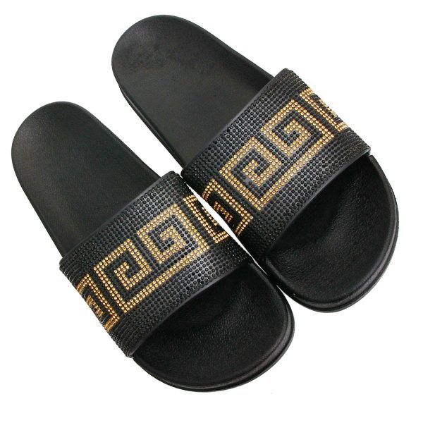 Size 11 Designer Inspired Black and Gold Rhinestone Greek Key Pattern Slipper Slides Featuring Black Cushion Bottom and Non Slip Sole. Slides Run True to Size. Size Up for Half Sizes.