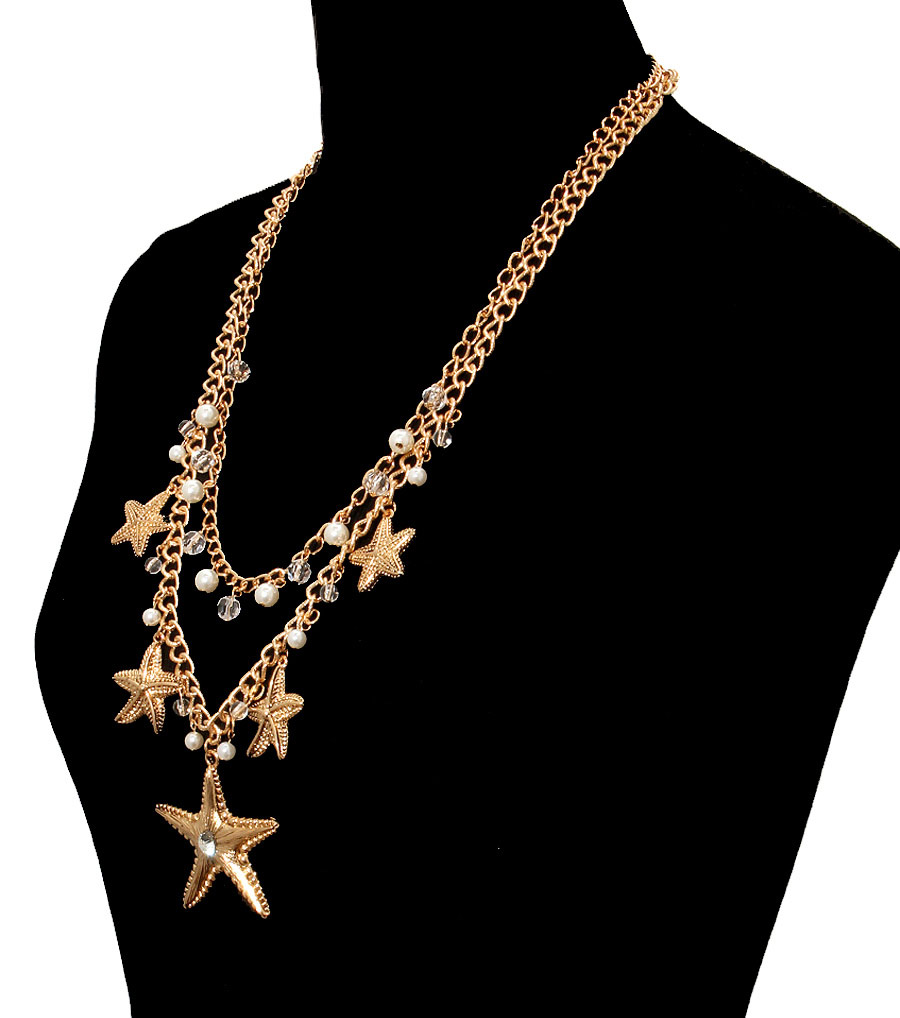 Gold metal chain necklace set with starfish charms. Lobster clasp closure