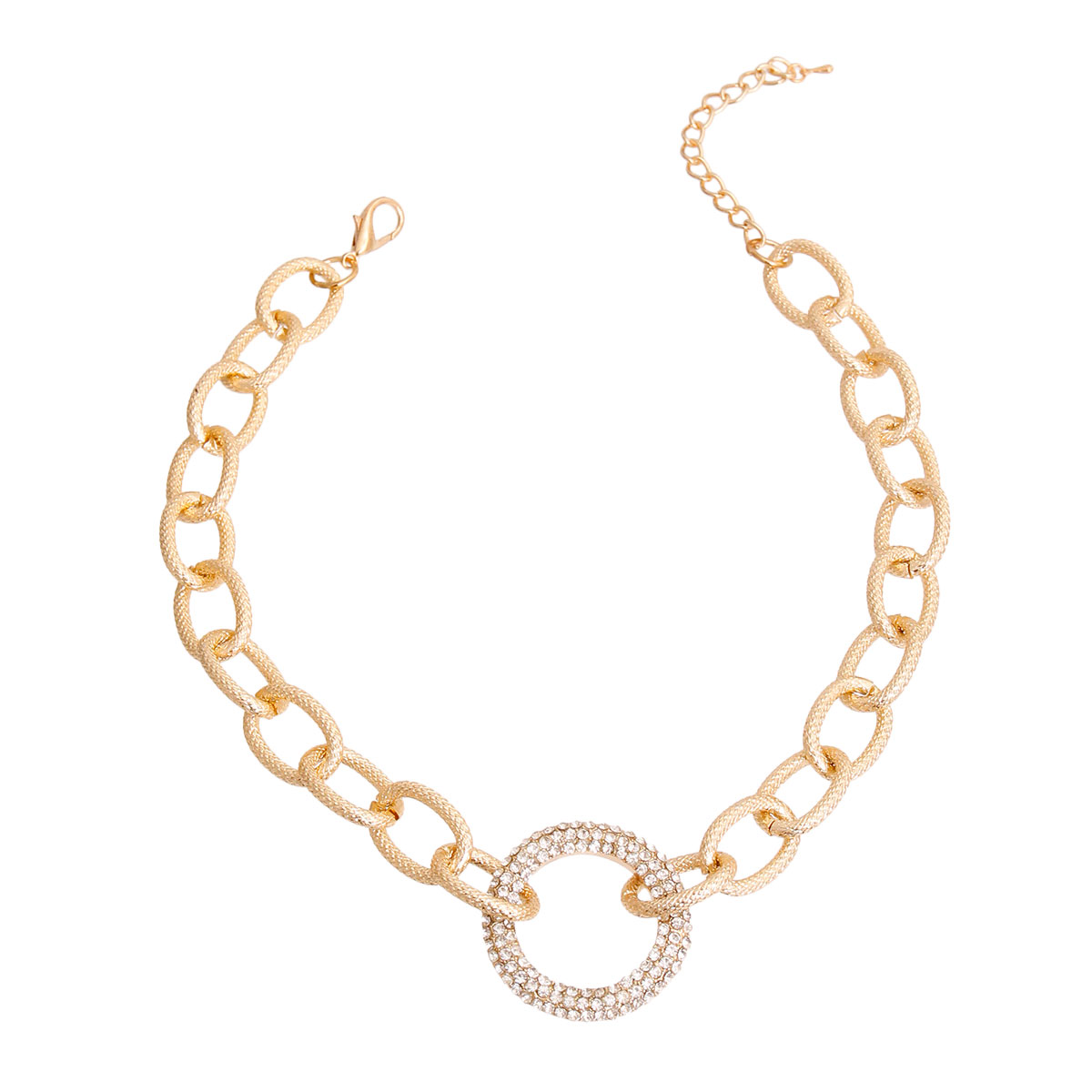 Textured Gold Metal Chain Necklace Featuring Pave Rhinestone Ring Pendant. Ring measures 1.25 inches