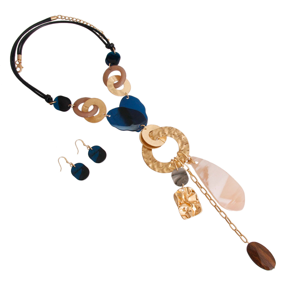 Black Layered Leather Cord Necklace Set Featuring Textured Metal and Marbled Acrylic Details. Gold Hammered Circle Pendant with Drop Chain and Wood Detail. Pendant measures 8 inches long
