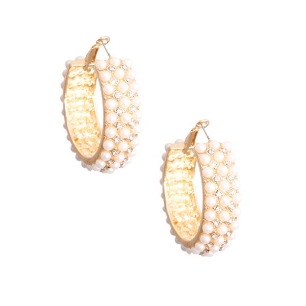 Gold Metal Wide Hoop Earrings Featuring Triple Lined Cream Pearl and Crystal Rhinestone Detailing. .75 inches wide