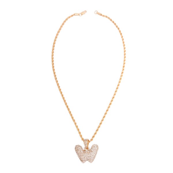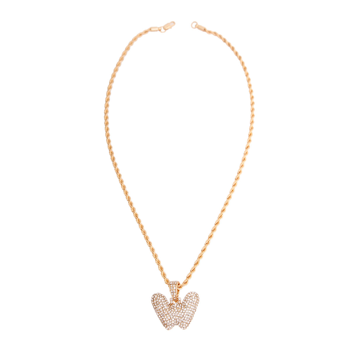 Gold Metal Twisted Chain Necklace Featuring Letter W Crystal Rhinestone Initial Pendant. Pendant measures 1.75 inches long