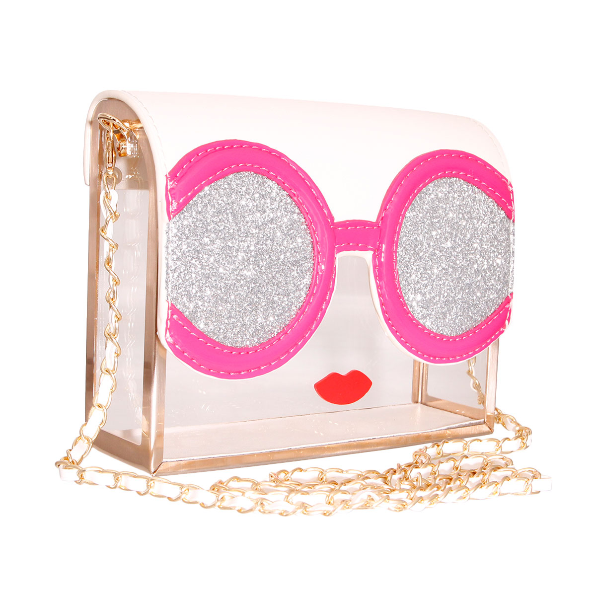 Metal and Clear Plastic Hardcase Boxy Crossbody Handbag Featuring White Vegan Leather Top Flap Snap Closure with Fuschia and Silver Glitter Sunglasses and Lips Detail. Detachable Woven Metal Shoulder Chain Included