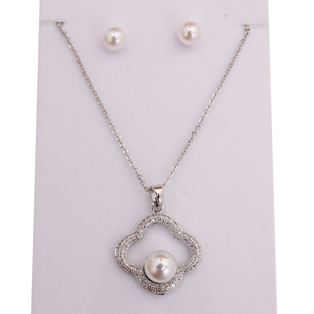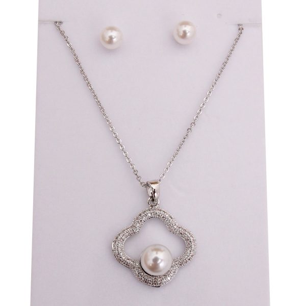 White Gold Plated Chain and Pendant Necklace Set Featuring Cubic Zirconia and White Pearl Pendant. Pendant measures .75 inches