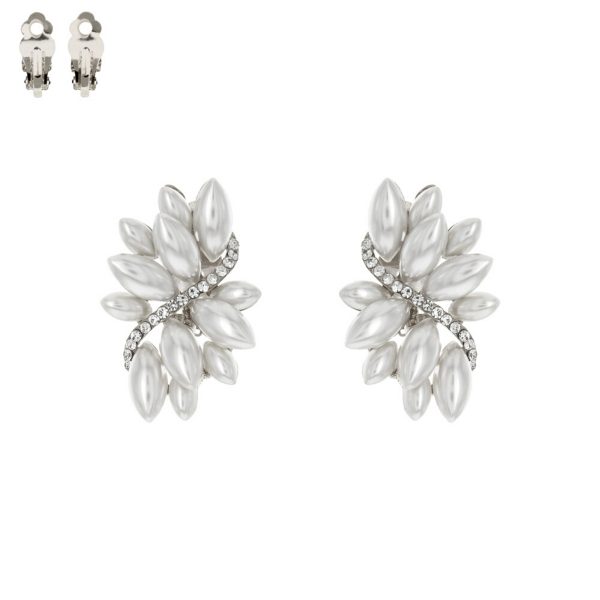 Silver Metal Clip On Earrings Featuring White Marquise Pearls and Rhinestones