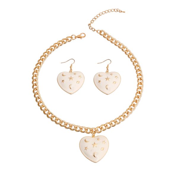 Gold Metal Chain Necklace Set Featuring White Metal Heart Pendant with Moon and Star Detailing. Heart measures 1.5 inches. Matching Heart Earrings