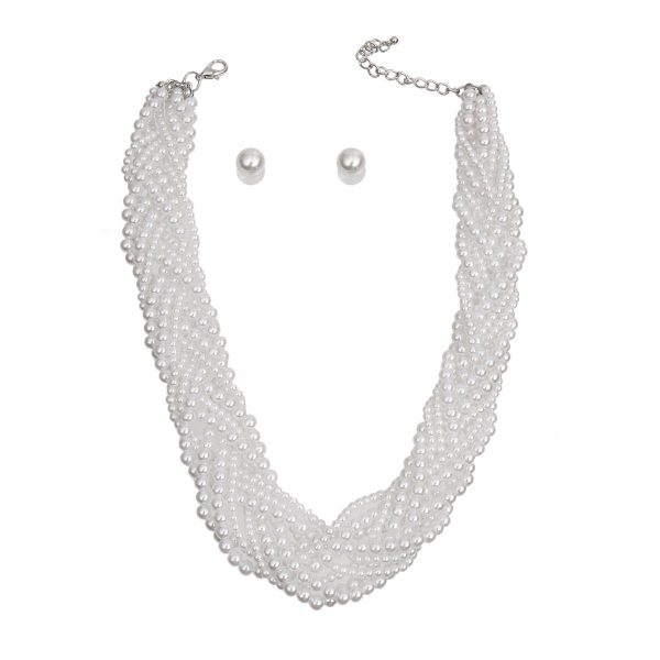 Silver and White Pearl Multi Strand Braided Necklace Set