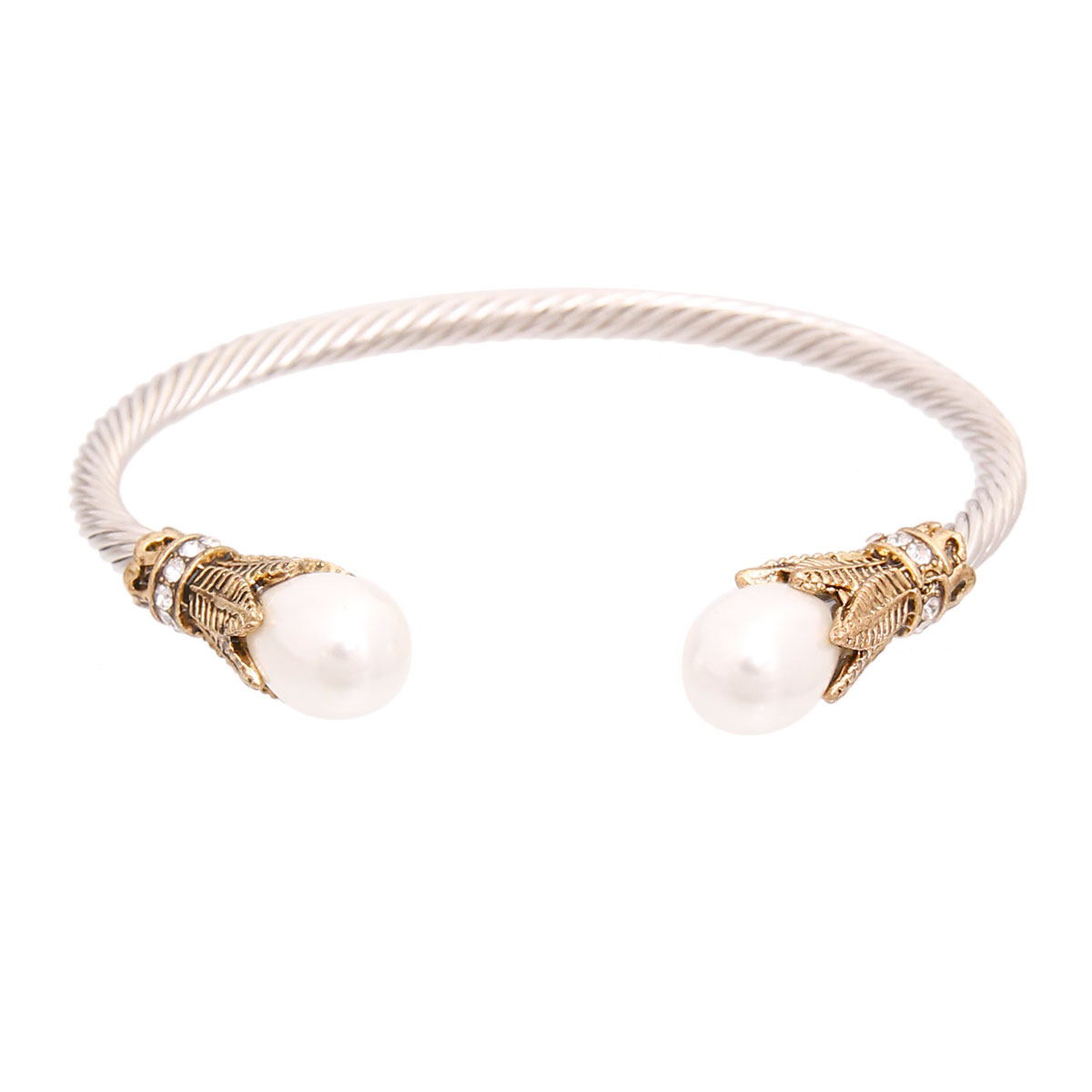 David Yurman Insired Cable Classic Mixed Metal Bangle Bracelet Featuring White Pearl with Elegant Engraved Leaf and Rhinestone Detailing