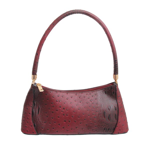 Wine Ostrich Vegan Leather Classic Shoulder Handbag Featuring Gold Metal Detaling. Main Zipper Closure.