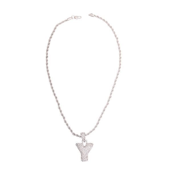 Silver Metal Twisted Chain Necklace Featuring Letter Y Crystal Rhinestone Initial Pendant. Pendant measures 1.75 inches long