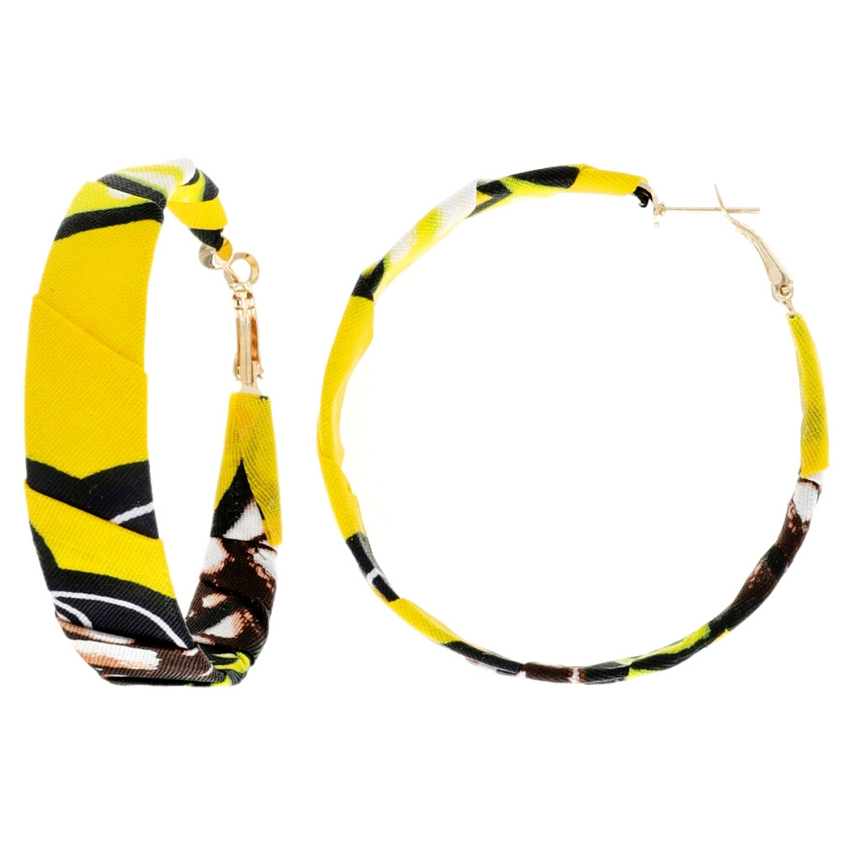 Yellow African Print Fabric Wrapped Gold Metal Hoop Earrings. Earrings measure .75 inches wide