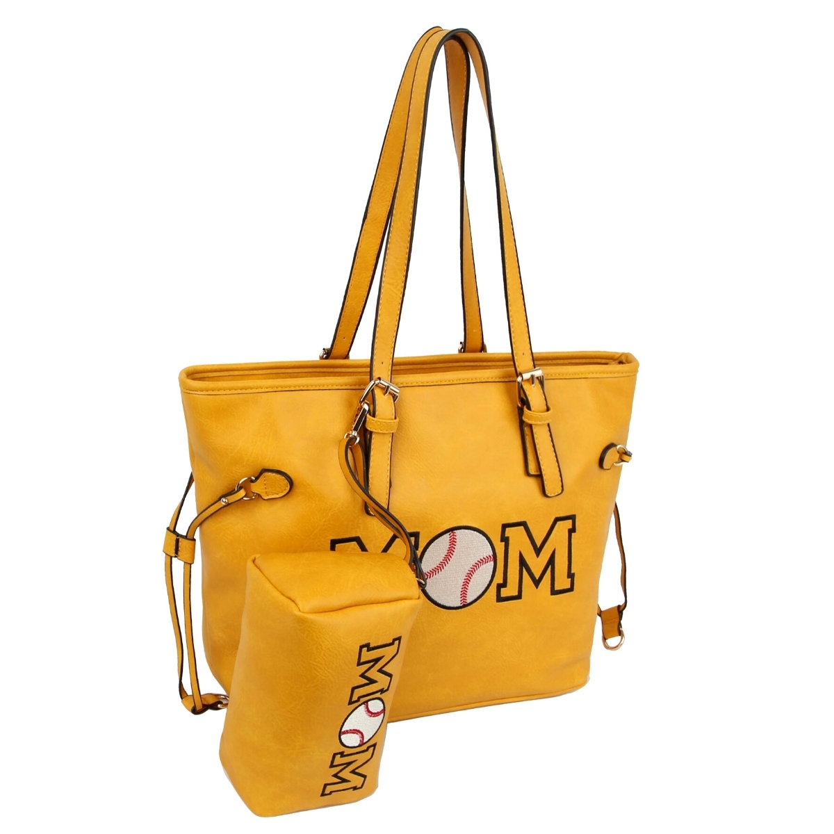 Yellow Vegan Leather MOM Baseball Embroidered Tote 3 Pcs Handbag Set. Main Zipper Closure and Rear Zipper Pockets. Has 2 Hanging Straps to Attach Included Wallet and Zipper Pouch. Zipper Wallet and Pouch Have Wristlet with Gold Metal Clip For Easy Attachment