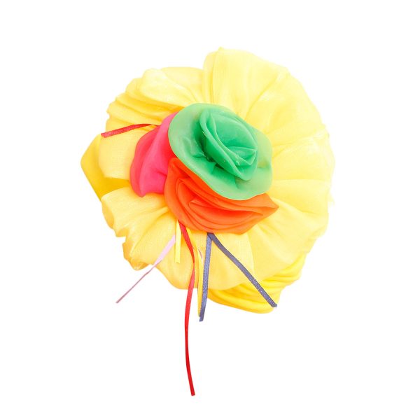 Yellow Fabric Pleated Stretch Hair Turban Head Wrap Featuring Multi Color Fabric Flower and Ribbon Detailing